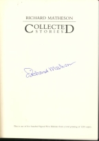 The Signature page of the Dream/press collection of RIchard Matheson's stories. Tor has recently issued a collection of his stories of terror, including 'Duel' which was made into a movie directed by a young fellow named Steven Spielberg. He did extremely well in that adaptation. |