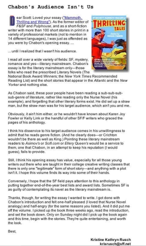 Rusch is right; Chabon's audience is essentially a pack of literary snobs. Rusch has good reason to feel a bit of resentment. Fifteen years ago, she created and edited 'Pulphouse', a hardcover anthology of literary pulp fiction featuring Harlan Ellison and a host of other fascinating writers. It's very fair to say Chabon's McSweeney's issue totally rips off Rusch's work. In fact, 'Pulphouse' is much better than McSweeney's Mammoth. It's hardcover. The selection of authors is more diverse, the book production is yards better, the non-fiction selections have more pith and diversity. It's safe to say that this is not a new phenomenon. Often the speculative fiction world gets there first and better than the literary world. Don't hate literature because it's beautiful!