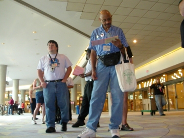 From noon until five PM, we shuttled from panel to panel to reading to reading to panel. It was pretty hectic. On our way from the reading to the panel, I saw Charlie Stross, and stopped and asked him about an interview for this column. I rather regretted it. Charlie is sort of the belle of the ball here -- from what I can tell -- and he quickly acquired the look of a butterfly contemplating the pin that was about to affix it to a Styrofoam display board. I had seen his posts on Usenet for a bezillion years, from back in the Quotron Days, and I'd obtained his signature on my convention book last year, in a line of one person. That's no excuse. I had seen him a couple of times the day before and I could see the desperation quotient rising as he scuttled about between the seemingly constant panels he'd been assigned to. What made it worse was that I had attended those panels, as they were actually in topics that interested me. On this final stop, I felt really bad, like some sort of stalker, which I wasn't. Really. I'd seen a couple of other writers I knew -- Cory Doctorow, and even Liz Williams the day after we'd had out Kaffeeklatsch. Claire identified the sort of walk that these writers have to assume. It's a quick stride, eyes fixed firmly on the sidewalk about six inches in front of their feet. The pressure to pack in a year's worth of publicity must be quite intense. On the other hand this may all be some sort of terror-noia (thanks Mr. Doctorow!) on my part. It's most likely that I'm fairly invisible.