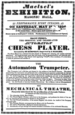 Playbill for the return of the Turk. After the death of the inventor, it was sold Johann Nepomuk Maelzel, who maintained the mystery for many more years. |
