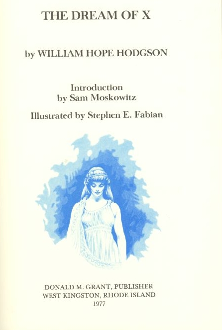 It's a $20 hardcover with a near fine DJ in a Demco library wrap. It's a Donald Grant publication from 1977, with an introduction by Sam Moskowitz. I don't know how many anthologies had passed through my teenaged hands with that name emblazoned somewhere on the cover of a book. I was pretty familiar with Hodgson's works, so I was curious as to what precisely 'The Dream of X' was and whether it would be worth the money. I picked it up, put it down, then picked it up again and read the introduction. I was just about able to pull up my jaw and stop drooling by the time I finished.