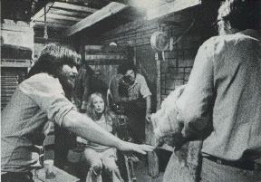 Tobe Hooper (left) in 1974 filming the barbecue scene.